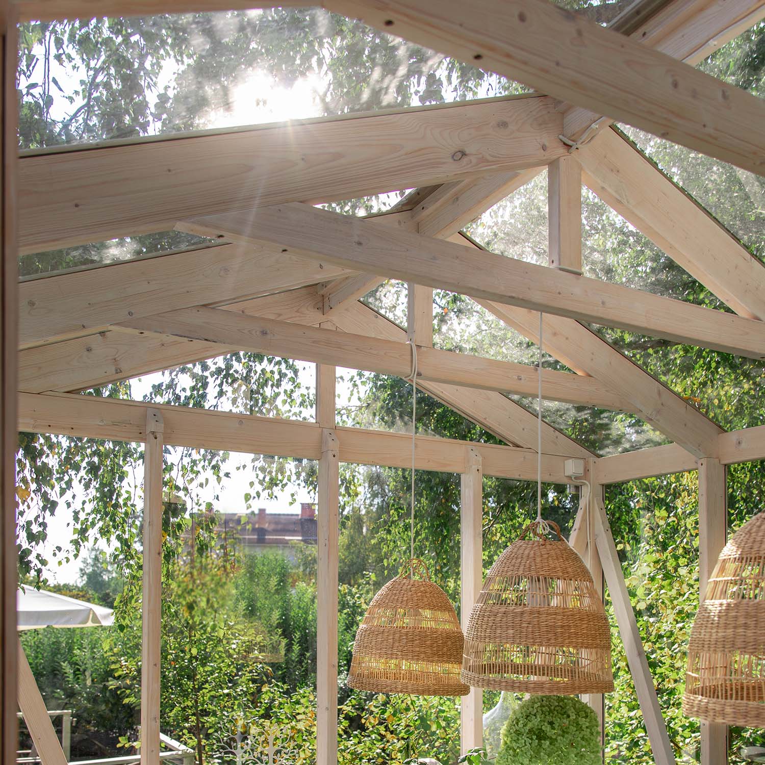 Alla bärande delar av växthuset Linnea är av C24-klassat konstruktionsvirke vilket innebär att de har hög hållfasthet och klarar en mycket hög belastning. Delarna har märken och spår efter hyvling och sågning.