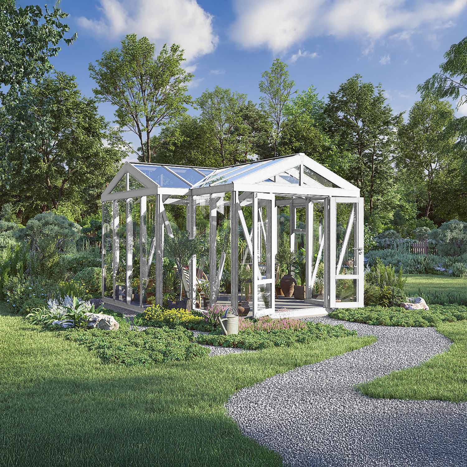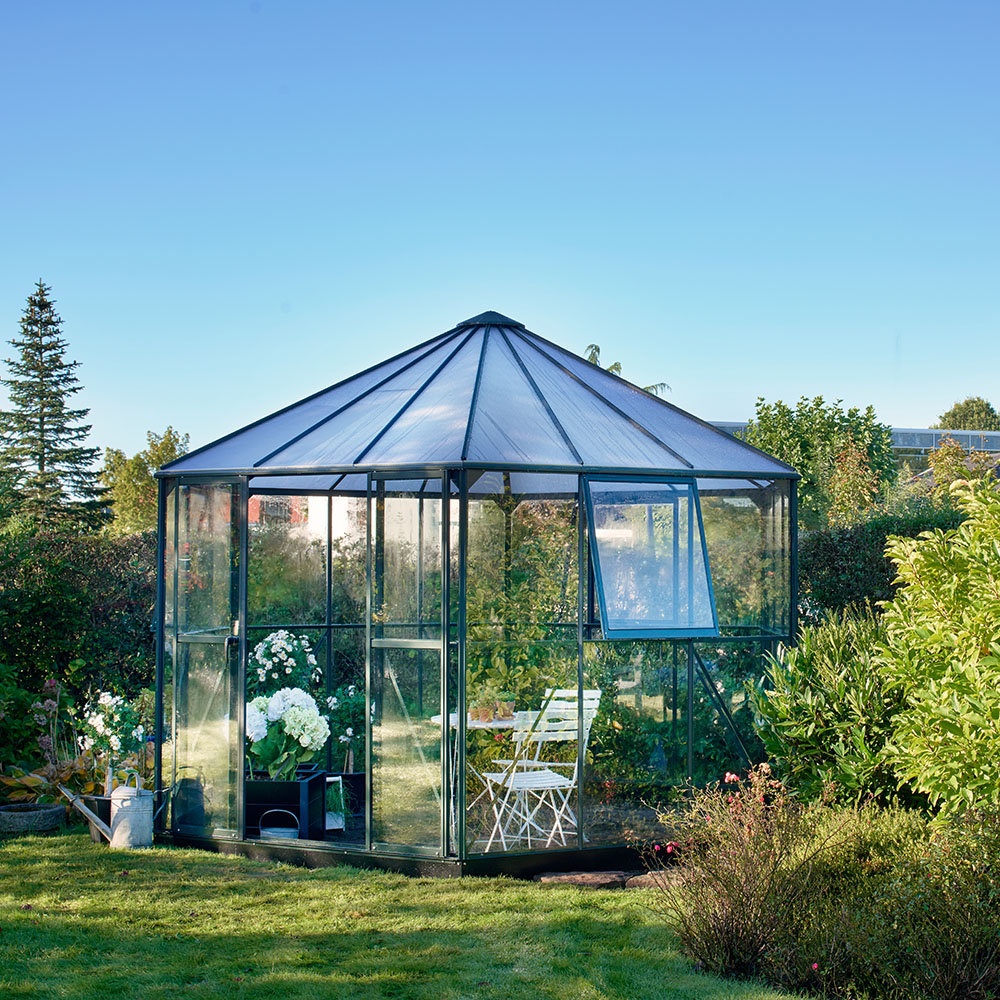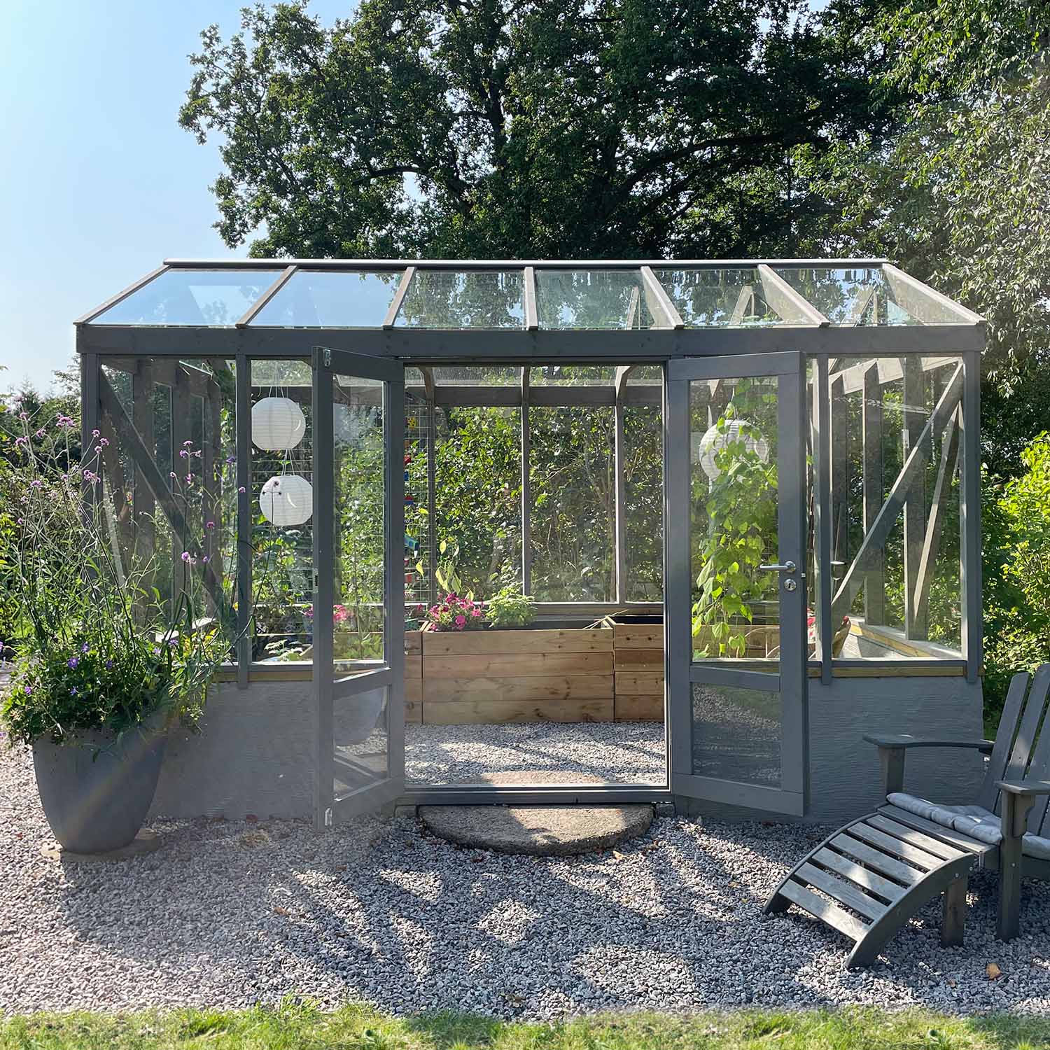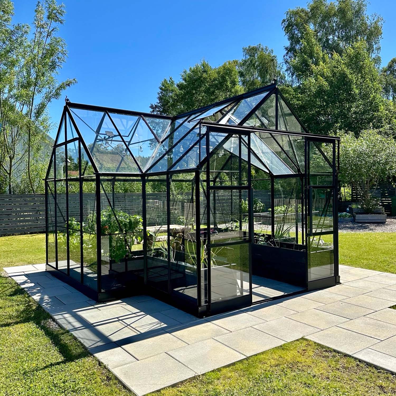 Möjligheten finns att även välja till takfönster eller hyllor för dina krukor och växter.